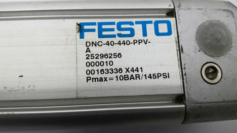 Festo DNC-40-440-PPV-1 Pneumatic Cylinder 145 PSI Return Policy Returns accepted within 30 days. Items sold as is cannot be returned, unless description is in error. Buyer pays return freight. Shipping Policy We ship almost all items with 1 business day of cleared payment. We ship USPS and UPS. We can ship on your account. If you will be shipping freight, please be sure to provide all delivery contact information including a phone number. We will need to know if you have a fork lift or dock.