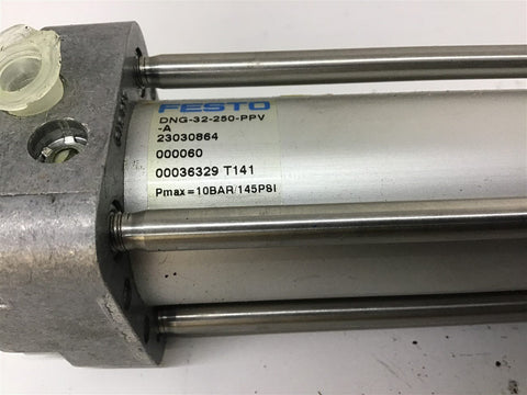 Festo DNG-32-250-PPV-A Pneumatic Cylinder 32mm Bore x 250mm Stroke Return Policy Returns accepted within 30 days. Items sold as is cannot be returned, unless description is in error. Buyer pays return freight. Shipping Policy We ship almost all items with 1 business day of cleared payment. We ship USPS and UPS. We can ship on your account. If you will be shipping freight, please be sure to provide all delivery contact information including a phone number. We will need to know if you have a fork lift or dock.