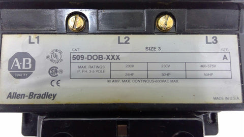 Allen Bradley 509-DOB-XX Starter Size 3 27 Amp 600 Vac 3 Pole 115-120V Coil