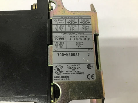 Allen-Bradley Bulletin 700 Type N AC Relay 700-N400A1 Ser C Return Policy Returns accepted within 30 days. Items sold as is cannot be returned, unless description is in error. Buyer pays return freight. Shipping Policy We ship almost all items with 1 business day of cleared payment. We ship USPS and UPS. We can ship on your account. If you will be shipping freight, please be sure to provide all delivery contact information including a phone number. We will need to know if you have a fork lift or dock.