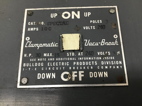 Bulldog Electric Special Clampmatic Vacu-Break Enclosure 100Amps 3 Poles 240V Return Policy Returns accepted within 30 days. Items sold as is cannot be returned, unless description is in error. Buyer pays return freight. Shipping Policy We ship almost all items with 1 business day of cleared payment. We ship USPS and UPS. We can ship on your account. If you will be shipping freight, please be sure to provide all delivery contact information including a phone number. We will need to know if you have a fork lift or dock.