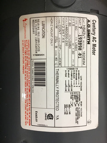 A.O. Smith H843V1 1 1/2 Hp AC Motor 460/200-230 Volts 3450 Rpm 2P 56H Frame Return Policy Returns accepted within 30 days. Items sold as is cannot be returned, unless description is in error. Buyer pays return freight. Shipping Policy We ship almost all items with 1 business day of cleared payment. We ship USPS and UPS. We can ship on your account. If you will be shipping freight, please be sure to provide all delivery contact information including a phone number. We will need to know if you have a fork lift or dock.