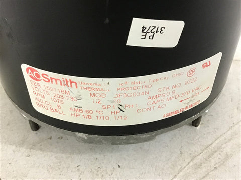 A.O. Smith OF3G034N 1/8 1/10 1/12 HP Motor 208/-230 Volts 1075 Rpm Single Phase Return Policy Returns accepted within 30 days. Items sold as is cannot be returned, unless description is in error. Buyer pays return freight. Shipping Policy We ship almost all items with 1 business day of cleared payment. We ship USPS and UPS. We can ship on your account. If you will be shipping freight, please be sure to provide all delivery contact information including a phone number. We will need to know if you have a fork lift or dock.