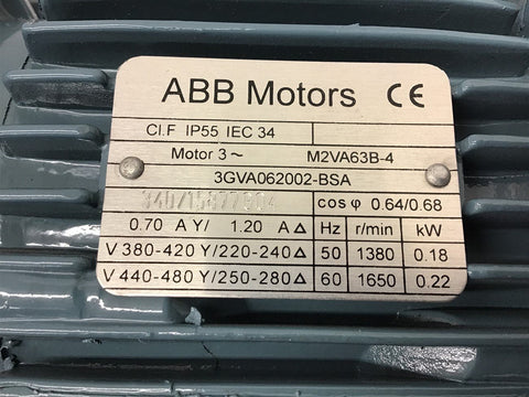 ABB Motors 3GVA062002-BSA 0.22 KW AC Motor 440-480/250-280 Volts 1650 Rpm Return Policy Returns accepted within 30 days. Items sold as is cannot be returned, unless description is in error. Buyer pays return freight. Shipping Policy We ship almost all items with 1 business day of cleared payment. We ship USPS and UPS. We can ship on your account. If you will be shipping freight, please be sure to provide all delivery contact information including a phone number. We will need to know if you have a fork lift or dock.