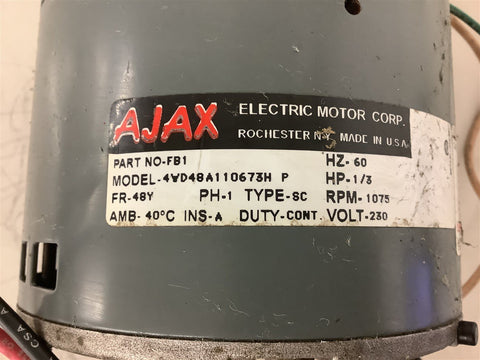 Ajax 4WD48A110673H 1/3 Hp AC Motor 1075 Rpm 230 volt 48Y Frame Return Policy Returns accepted within 30 days. Items sold as is cannot be returned, unless description is in error. Buyer pays return freight. Shipping Policy We ship almost all items with 1 business day of cleared payment. We ship USPS and UPS. We can ship on your account. If you will be shipping freight, please be sure to provide all delivery contact information including a phone number. We will need to know if you have a fork lift or dock.
