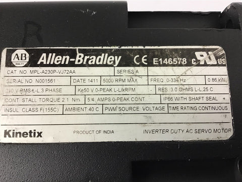 Allen-Bradley MPL-A230P-VJ72AA Servo Motor 0.86 KW 5000 Rpm Return Policy Returns accepted within 30 days. Items sold as is cannot be returned, unless description is in error. Buyer pays return freight. Shipping Policy We ship almost all items with 1 business day of cleared payment. We ship USPS and UPS. We can ship on your account. If you will be shipping freight, please be sure to provide all delivery contact information including a phone number. We will need to know if you have a fork lift or dock.