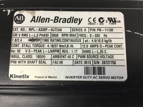 Allen-Bradley MPL-A330P-HJ2AA 230 volts AC Servo Motor 5000 Rpm Return Policy Returns accepted within 30 days. Items sold as is cannot be returned, unless description is in error. Buyer pays return freight. Shipping Policy We ship almost all items with 1 business day of cleared payment. We ship USPS and UPS. We can ship on your account. If you will be shipping freight, please be sure to provide all delivery contact information including a phone number. We will need to know if you have a fork lift or dock.