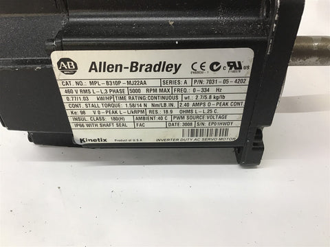 Allen-Bradley MPL-B310P-MJ22AA Servo Motor 460 V 5000 RPM 1.03 HP Return Policy Returns accepted within 30 days. Items sold as is cannot be returned, unless description is in error. Buyer pays return freight. Shipping Policy We ship almost all items with 1 business day of cleared payment. We ship USPS and UPS. We can ship on your account. If you will be shipping freight, please be sure to provide all delivery contact information including a phone number. We will need to know if you have a fork lift or dock.