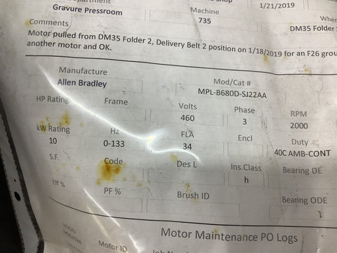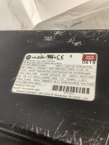 Allen Bradly MPL-B680D -SJ22AA AC Motor Series A 480V 3PH 2000RPM 9.3/12.4KW/HP Return Policy Returns accepted within 30 days. Items sold as is cannot be returned, unless description is in error. Buyer pays return freight. Shipping Policy We ship almost all items with 1 business day of cleared payment. We ship USPS and UPS. We can ship on your account. If you will be shipping freight, please be sure to provide all delivery contact information including a phone number. We will need to know if you have a fork lift or dock.
