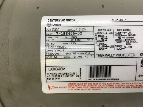 AO Smith C330 1/3 HP AC Motor 115/230 Volts 1725 Rpm 56N Round Frame Return Policy Returns accepted within 30 days. Items sold as is cannot be returned, unless description is in error. Buyer pays return freight. Shipping Policy We ship almost all items with 1 business day of cleared payment. We ship USPS and UPS. We can ship on your account. If you will be shipping freight, please be sure to provide all delivery contact information including a phone number. We will need to know if you have a fork lift or dock.
