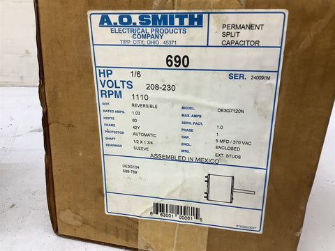 AO Smith DE3G7120N AC Motor 1/6HP 208-230V 1110RPM FR 42Y 60HZ Enclosed