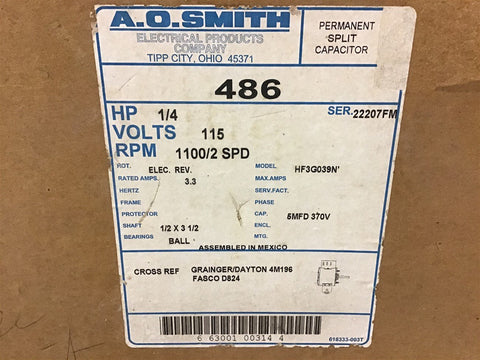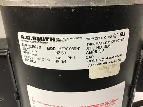 AO Smith HF3G039N Fan Motor 1/4 HP 1100/2 RPM 115V 1/2" Diameter
