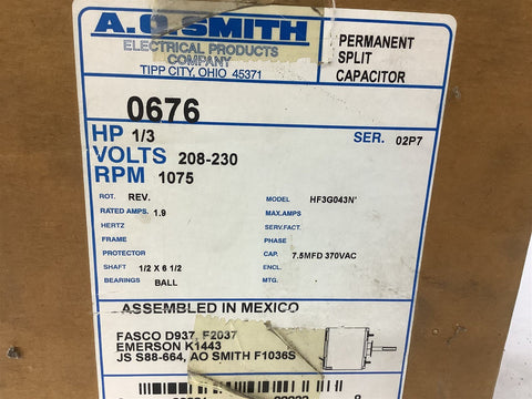 AO Smith HF3G043N AC Motor 1/3HP 208-230V 1075RPM Return Policy Returns accepted within 30 days. Items sold as is cannot be returned, unless description is in error. Buyer pays return freight. Shipping Policy We ship almost all items with 1 business day of cleared payment. We ship USPS and UPS. We can ship on your account. If you will be shipping freight, please be sure to provide all delivery contact information including a phone number. We will need to know if you have a fork lift or dock.