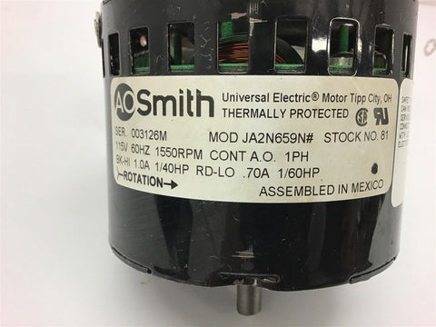 AO Smith JA2N659N# Motor 5/16"Bore 115V 1550 RPM 1/40HP Return Policy Returns accepted within 30 days. Items sold as is cannot be returned, unless description is in error. Buyer pays return freight. Shipping Policy We ship almost all items with 1 business day of cleared payment. We ship USPS and UPS. We can ship on your account. If you will be shipping freight, please be sure to provide all delivery contact information including a phone number. We will need to know if you have a fork lift or dock.