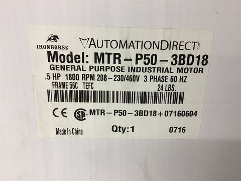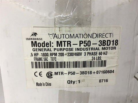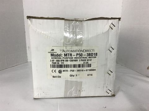 Automation Direct MTR-P50-3BD18 1/2 HP AC Motor 208-230/460 Volt 1800 Rpm 56C fr Return Policy Returns accepted within 30 days. Items sold as is cannot be returned, unless description is in error. Buyer pays return freight. Shipping Policy We ship almost all items with 1 business day of cleared payment. We ship USPS and UPS. We can ship on your account. If you will be shipping freight, please be sure to provide all delivery contact information including a phone number. We will need to know if you have a fork lift or dock.