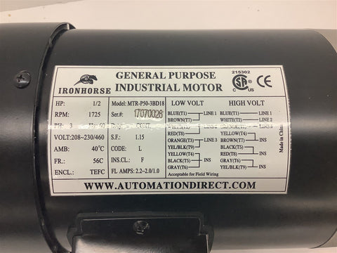 Automation Direct MTR-P50-3BD18 1/2 HP AC Motor 208-230/460 Volts 1800 Rpm 56C Return Policy Returns accepted within 30 days. Items sold as is cannot be returned, unless description is in error. Buyer pays return freight. Shipping Policy We ship almost all items with 1 business day of cleared payment. We ship USPS and UPS. We can ship on your account. If you will be shipping freight, please be sure to provide all delivery contact information including a phone number. We will need to know if you have a fork lift or dock.
