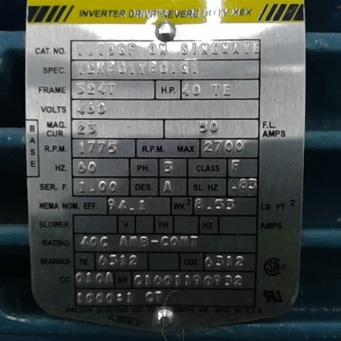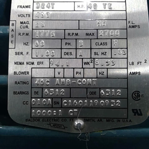 Baldor 12H801Y601G1 40 HP 460 Volts 1800 Rpm 4P 324T Frame 3PH Return Policy Returns accepted within 30 days. Items sold as is cannot be returned, unless description is in error. Buyer pays return freight. Shipping Policy We ship almost all items with 1 business day of cleared payment. We ship USPS and UPS. We can ship on your account. If you will be shipping freight, please be sure to provide all delivery contact information including a phone number. We will need to know if you have a fork lift or dock.