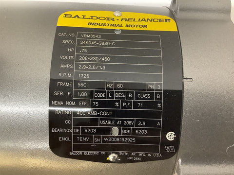 Baldor VBM3542 AC Motor .75 Hp 208-230/460 V 1800 Rpm 4P 56C 3 Ph 60 Hz TENV Return Policy Returns accepted within 30 days. Items sold as is cannot be returned, unless description is in error. Buyer pays return freight. Shipping Policy We ship almost all items with 1 business day of cleared payment. We ship USPS and UPS. We can ship on your account. If you will be shipping freight, please be sure to provide all delivery contact information including a phone number. We will need to know if you have a fork lift or dock.