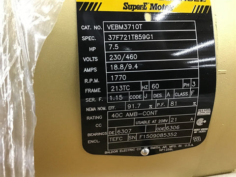 Baldor VEBM3710T 7.5HP AC Motor 1800 Rpm 4P 230/460 1800 Rpm With Brake Return Policy Returns accepted within 30 days. Items sold as is cannot be returned, unless description is in error. Buyer pays return freight. Shipping Policy We ship almost all items with 1 business day of cleared payment. We ship USPS and UPS. We can ship on your account. If you will be shipping freight, please be sure to provide all delivery contact information including a phone number. We will need to know if you have a fork lift or dock.
