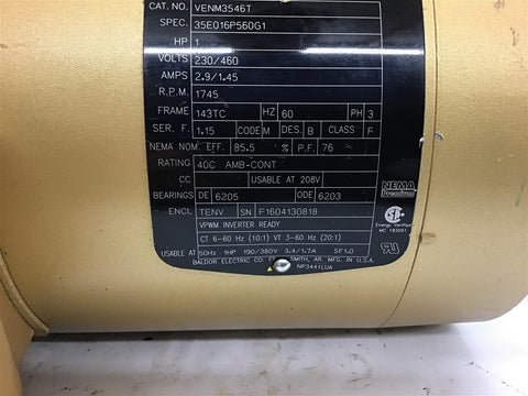 Baldor VENM3546t 1 HP AC Motor 230/460 volts 1800 rpm 4P 143TC Frame Return Policy Returns accepted within 30 days. Items sold as is cannot be returned, unless description is in error. Buyer pays return freight. Shipping Policy We ship almost all items with 1 business day of cleared payment. We ship USPS and UPS. We can ship on your account. If you will be shipping freight, please be sure to provide all delivery contact information including a phone number. We will need to know if you have a fork lift or dock.