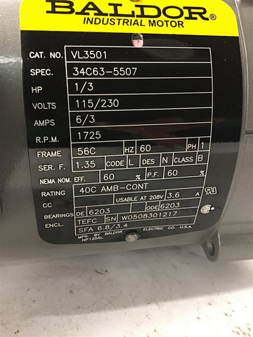Baldor VL3501 1/3 HP AC Motor 115/230 Volts Single Phase 1800 Rpm 4P 56C Frame Return Policy Returns accepted within 30 days. Items sold as is cannot be returned, unless description is in error. Buyer pays return freight. Shipping Policy We ship almost all items with 1 business day of cleared payment. We ship USPS and UPS. We can ship on your account. If you will be shipping freight, please be sure to provide all delivery contact information including a phone number. We will need to know if you have a fork lift or dock.