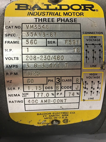 Baldor VM3546 1 HP AC Motor 208-230/460 Volts 1800 Rpm 56C Frame
