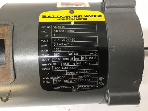 Baldor VM3546 AC Motor 1 HP 208-230/460V 1725 RPM 4 P 56C 3 PH 60 Hz TEFC