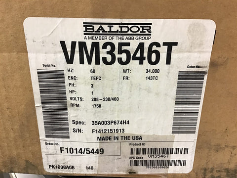 Baldor VM3546T AC Motor 1 HP 1750 RPM 4 Poles 208-230/460 VAC 143TCD Frame 3 Ph