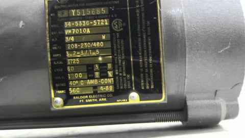 Baldor VM7010A 3/4hp AC Motor 1800rpm 4p 3ph 56C 208-230/460v 60hz