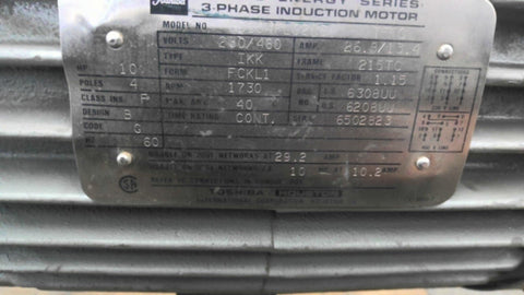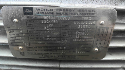 With Toshiba B0104FLC2UD 10HP AC Motor 1800Rpm 4P 3Ph TEFC 230/460V 60Hz ---Used--Good Visual Condition---3/24/LB ----- QTY 2 Cave City--- QTY 2 Brownsville