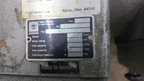 Becker KVT 2.140 10 Hp Pump 1700 Rpm 100 CFM 230/460 Volts Return Policy Returns accepted within 30 days. Items sold as is cannot be returned, unless description is in error. Buyer pays return freight. Shipping Policy We ship almost all items with 1 business day of cleared payment. We ship USPS and UPS. We can ship on your account. If you will be shipping freight, please be sure to provide all delivery contact information including a phone number. We will need to know if you have a fork lift or dock.