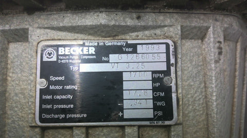 Becker VT 3.25 Vacuum Pump 1700 Rpm 17.6 CFM Return Policy Returns accepted within 30 days. Items sold as is cannot be returned, unless description is in error. Buyer pays return freight. Shipping Policy We ship almost all items with 1 business day of cleared payment. We ship USPS and UPS. We can ship on your account. If you will be shipping freight, please be sure to provide all delivery contact information including a phone number. We will need to know if you have a fork lift or dock.