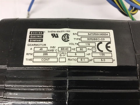 Bodine 30R2BECI-D3 Gear Motor 1/30 HP .45 A 115 volt 6:1 Ratio 285 Rpm Return Policy Returns accepted within 30 days. Items sold as is cannot be returned, unless description is in error. Buyer pays return freight. Shipping Policy We ship almost all items with 1 business day of cleared payment. We ship USPS and UPS. We can ship on your account. If you will be shipping freight, please be sure to provide all delivery contact information including a phone number. We will need to know if you have a fork lift or dock.