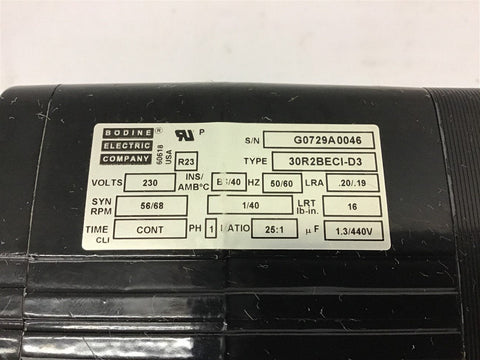 Bodine 30R2BECI-D3 GearMotor 1/40 HP 25:1 Ratio 230 volts 56/68 Rpm