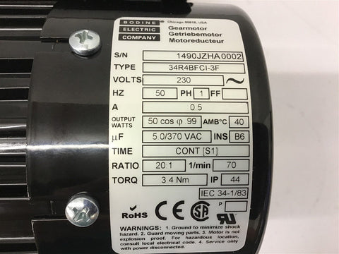 Bodine 34R4BFCI-3F 50 Watts AC GearMotor 230 Volts Single Phase 20:1 Ratio Return Policy Returns accepted within 30 days. Items sold as is cannot be returned, unless description is in error. Buyer pays return freight. Shipping Policy We ship almost all items with 1 business day of cleared payment. We ship USPS and UPS. We can ship on your account. If you will be shipping freight, please be sure to provide all delivery contact information including a phone number. We will need to know if you have a fork lift or dock.