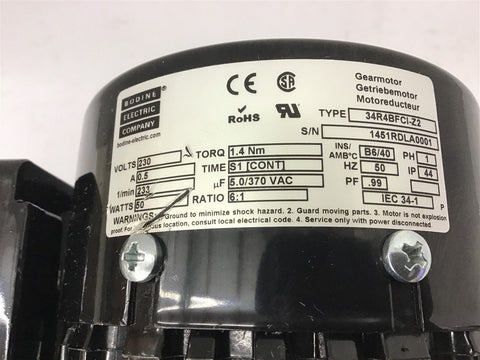 Bodine 34R4BFCI-Z2 AC GearMotor 50 HZ 50 Watts 6:1 Ratio 233 Rpm Single Phase Return Policy Returns accepted within 30 days. Items sold as is cannot be returned, unless description is in error. Buyer pays return freight. Shipping Policy We ship almost all items with 1 business day of cleared payment. We ship USPS and UPS. We can ship on your account. If you will be shipping freight, please be sure to provide all delivery contact information including a phone number. We will need to know if you have a fork lift or dock.