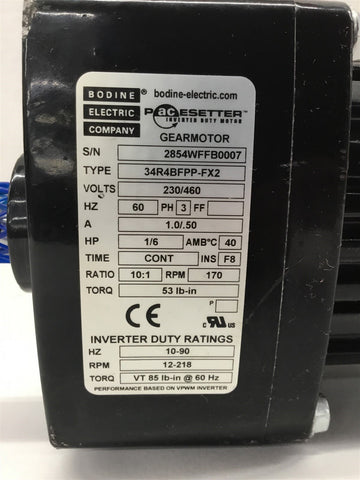 Bodine 34R4BFPP-FX2 Electric Gearmotor 230/460V 60HZ 3PH 1/6HP 10:1 Ratio 170Rpm