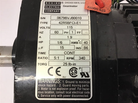 Bodine 42R5BFCI-E1 1/6 HP AC Gear Motor 115 Volts 5:1 Ratio 340 Rpm