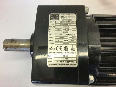 Bodine 42R6BFPP-F1 3/8 Hp AC Gear Motor 5:1 Ratio 340 Rpm Return Policy Returns accepted within 30 days. Items sold as is cannot be returned, unless description is in error. Buyer pays return freight. Shipping Policy We ship almost all items with 1 business day of cleared payment. We ship USPS and UPS. We can ship on your account. If you will be shipping freight, please be sure to provide all delivery contact information including a phone number. We will need to know if you have a fork lift or dock.