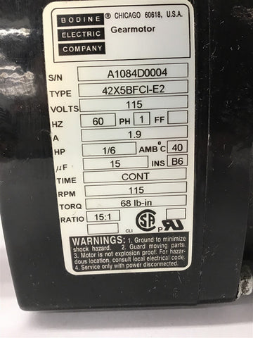 Bodine 42X5BFCI-E2 1/6 HP AC Gear Motor 115 Volts Single Phase 15:1 Ratio Return Policy Returns accepted within 30 days. Items sold as is cannot be returned, unless description is in error. Buyer pays return freight. Shipping Policy We ship almost all items with 1 business day of cleared payment. We ship USPS and UPS. We can ship on your account. If you will be shipping freight, please be sure to provide all delivery contact information including a phone number. We will need to know if you have a fork lift or dock.