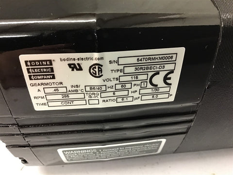 Bodine 5470RM Gearmotor 1/30 HP 285 RPM 6:1 Ratio 115V 0.45 Amps Return Policy Returns accepted within 30 days. Items sold as is cannot be returned, unless description is in error. Buyer pays return freight. Shipping Policy We ship almost all items with 1 business day of cleared payment. We ship USPS and UPS. We can ship on your account. If you will be shipping freight, please be sure to provide all delivery contact information including a phone number. We will need to know if you have a fork lift or dock.
