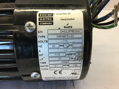 Bodine Electric 34R4BFCI-Z2 1/15 Hp AC Motor 115 Volts 12:1 Ratio Single Phase Return Policy Returns accepted within 30 days. Items sold as is cannot be returned, unless description is in error. Buyer pays return freight. Shipping Policy We ship almost all items with 1 business day of cleared payment. We ship USPS and UPS. We can ship on your account. If you will be shipping freight, please be sure to provide all delivery contact information including a phone number. We will need to know if you have a fork lift or dock.