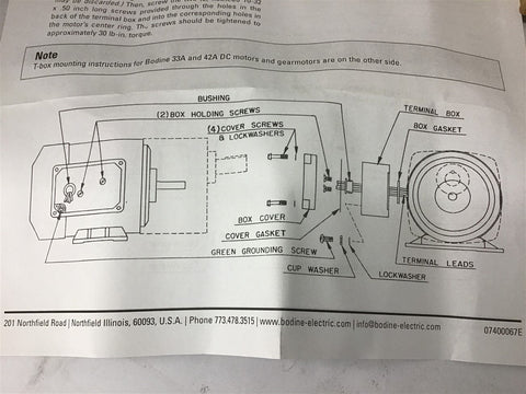Bodine Electric Model No. 984QN Terminal Box Kit Return Policy Returns accepted within 30 days. Items sold as is cannot be returned, unless description is in error. Buyer pays return freight. Shipping Policy We ship almost all items with 1 business day of cleared payment. We ship USPS and UPS. We can ship on your account. If you will be shipping freight, please be sure to provide all delivery contact information including a phone number. We will need to know if you have a fork lift or dock.