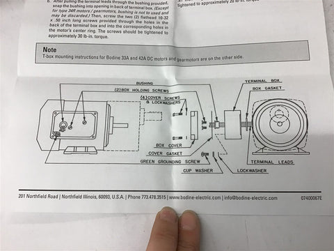 Bodine Electric Model No. 984UE Terminal Box Kit Return Policy Returns accepted within 30 days. Items sold as is cannot be returned, unless description is in error. Buyer pays return freight. Shipping Policy We ship almost all items with 1 business day of cleared payment. We ship USPS and UPS. We can ship on your account. If you will be shipping freight, please be sure to provide all delivery contact information including a phone number. We will need to know if you have a fork lift or dock.