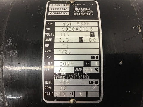 Bodine electric NSH-55RH 1/4 HP AC Gear Motor 115 Volts 1725 rpm 48:1 Ratio