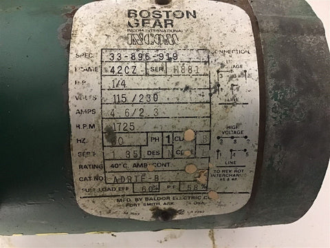 Boston Gear 33-896-919 1/4 HP AC Motor 115/230 Volts 1800 Rpm 4P 42CZ Return Policy Returns accepted within 30 days. Items sold as is cannot be returned, unless description is in error. Buyer pays return freight. Shipping Policy We ship almost all items with 1 business day of cleared payment. We ship USPS and UPS. We can ship on your account. If you will be shipping freight, please be sure to provide all delivery contact information including a phone number. We will need to know if you have a fork lift or dock.