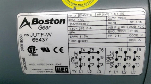 Boston JUTF-W65437 Gear Motor 1.5 HP 208-230/460V 1800 Rpm 4P 143/5TC 10:1 Ratio Return Policy Returns accepted within 30 days. Items sold as is cannot be returned, unless description is in error. Buyer pays return freight. Shipping Policy We ship almost all items with 1 business day of cleared payment. We ship USPS and UPS. We can ship on your account. If you will be shipping freight, please be sure to provide all delivery contact information including a phone number. We will need to know if you have a fork lift or dock.