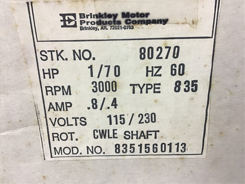 Brinkley 80270 1/70 HP AC Blower 3000 Rpm 115/230 Volts Return Policy Returns accepted within 30 days. Items sold as is cannot be returned, unless description is in error. Buyer pays return freight. Shipping Policy We ship almost all items with 1 business day of cleared payment. We ship USPS and UPS. We can ship on your account. If you will be shipping freight, please be sure to provide all delivery contact information including a phone number. We will need to know if you have a fork lift or dock.
