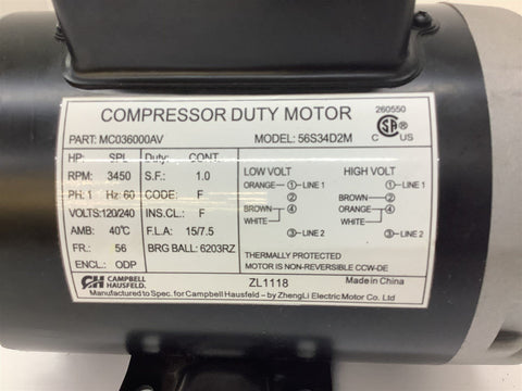 Campbell Hausfeld 56S34D2M Motor SPL HP 120/240V 3450RPM 56FR 1PH 60Hz ODP Return Policy Returns accepted within 30 days. Items sold as is cannot be returned, unless description is in error. Buyer pays return freight. Shipping Policy We ship almost all items with 1 business day of cleared payment. We ship USPS and UPS. We can ship on your account. If you will be shipping freight, please be sure to provide all delivery contact information including a phone number. We will need to know if you have a fork lift or dock.