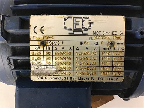 CEG 71A-4 .30 KW AC Motor 265/460 Volts 1692 Rpm 60 HZ Return Policy Returns accepted within 30 days. Items sold as is cannot be returned, unless description is in error. Buyer pays return freight. Shipping Policy We ship almost all items with 1 business day of cleared payment. We ship USPS and UPS. We can ship on your account. If you will be shipping freight, please be sure to provide all delivery contact information including a phone number. We will need to know if you have a fork lift or dock.